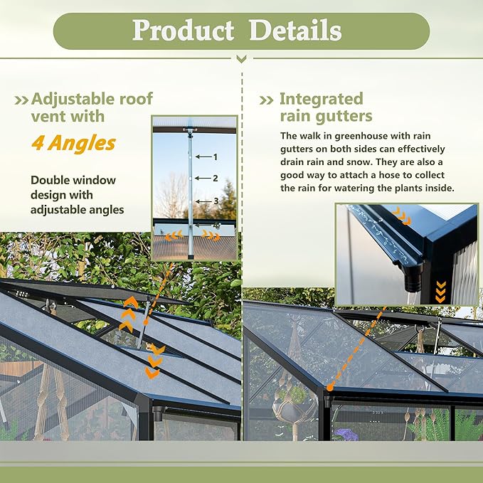 - Adjustable Roof Vents Equipped with two adjustable roof vents, this greenhouse allows for natural ventilation, keeping your plants healthy. The vents facilitate the entry of beneficial insects for pollination while ensuring a steady supply of fresh air—essential for any thriving garden.
