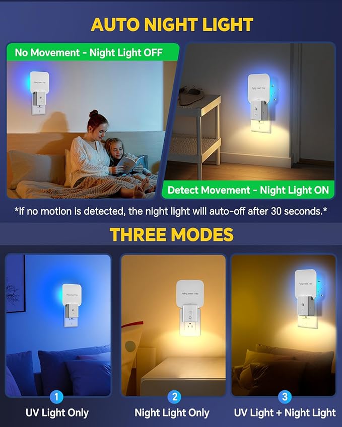 - ✅【2 in 1 Fly Trap with Night Light】Our flying insect trap features an auto sensor night light to help you navigate your home at night. The night light is glare-free and non-dazzling. You can use the UV light and night light together or separately, based on your needs.