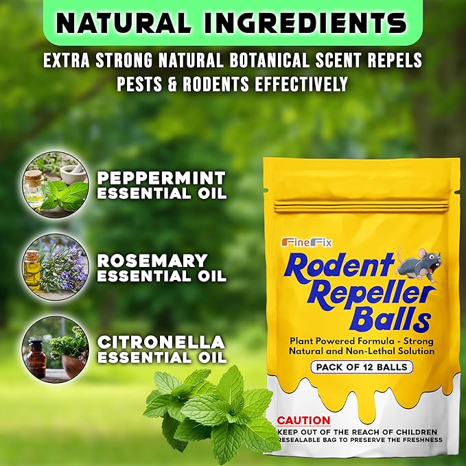 - NATURAL POTENT FORMULA: FineFix moth balls for rodents combimes a powerful blend of essential oils including peppermint, citronella and rosemary oils which gives 100% natural protection. This unique formula creates an odor very irritating to rodents for robust deterring against mice, rats, squirrels, roaches, spider, snakes and other pests.