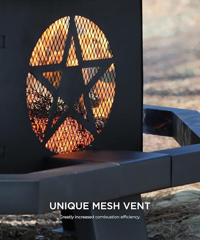 - 【SUNOUTLY'S ELEGANT DESIGN】The pentagram geometric cut-out design on the side of the wood-burning fire pit captures firelight to produce whimsical shadows. The drilled design maintains the flames strong and encourages airflow. All elegant designs of the fire pits for outside are dedicated to the warmth and comfort for you.