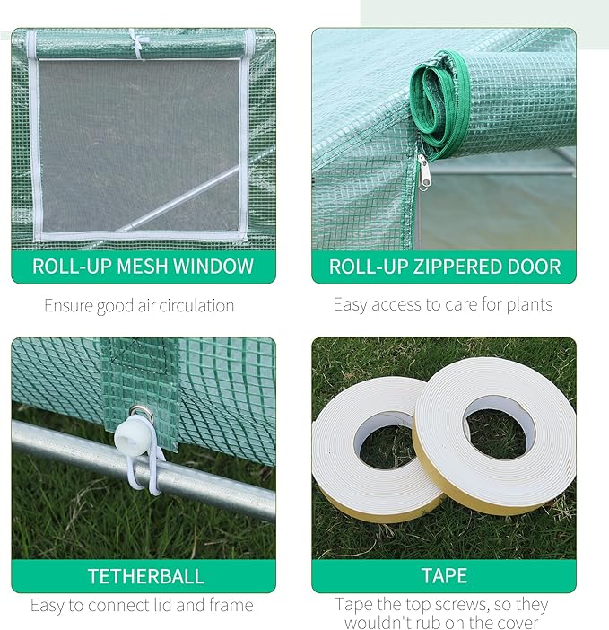 - Heavy-Duty Steel Frame: Our outside greenhouse features a chip-resistant galvanized steel frame with seven rows of reinforcing tubes, a crossbar, and four slant bracing tubes, each featuring a 0.94" thick diameter. Note: Please remove the cover in case of heavy snow, strong wind, and heavy rain.