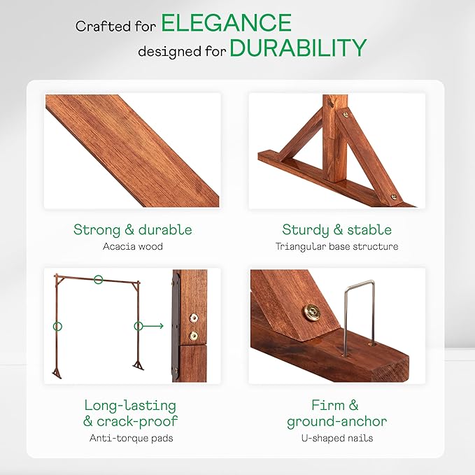 - DURABLE WOODEN FRAME: Made from durable acacia wood with reinforced base for stability, this arch backdrop stand withstands outdoor conditions for long-lasting use; It supports heavy floral arrangements without wobbling, seamlessly blending with rustic wedding decor