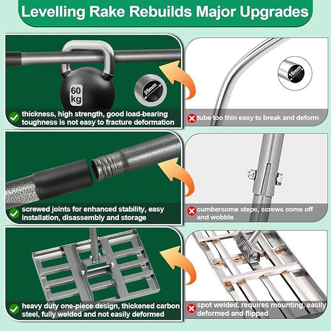 - All-Steel Durability You Can Trust: This 30 inch lawn leveling rake is suitable for heavy duty gardening work. Made from premium carbon steel, our leveling rake for soil is built for intense use without bending or breaking. The rust-resistant coating protects your ground leveler for yard, ensuring long-term value without repurchase