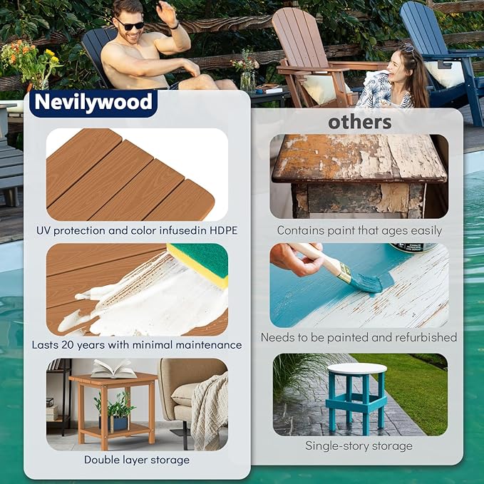 - ❀Designed for Outdoor Use: Nevilywood HDPE Side Table is weather resistant in harsh climates, will not crack, peel, and will maintain its brilliant colors for a long time. Can be used outdoors all year round.