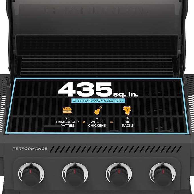 - COOKING AREA: Enjoy 435-square-inches of cooking space to grill up to 25 burgers at a time. Easily multitask with the 130-square-inch swing away warming rack to cook with indirect heat or to keep food warm.