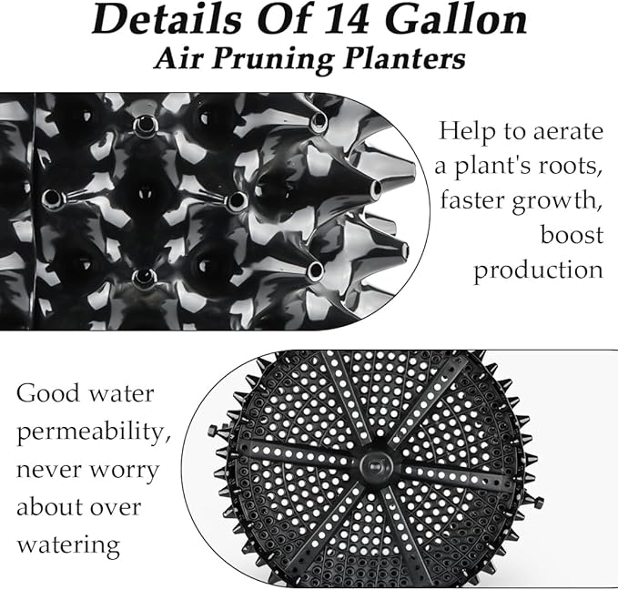- 14 Gallon Air Root Pruning Planters - 5 Pack: Each set includes two sheets, one round base, and six screws. There are five sets in total. To ensure the best fit for your plant, please refer to the product dimensions when selecting a root control container