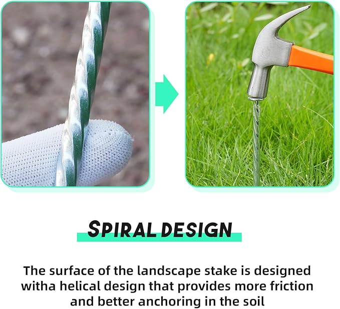 - Spiral Design: Landscape stake adopts a spiral design, so it has very good stability, which can stabilize and fix the garden landscape edging and the weed barrier. This design allows the stakes to obtain strong friction when penetrating into the soil, so that the stakes can stay firmly in the soil without loosening