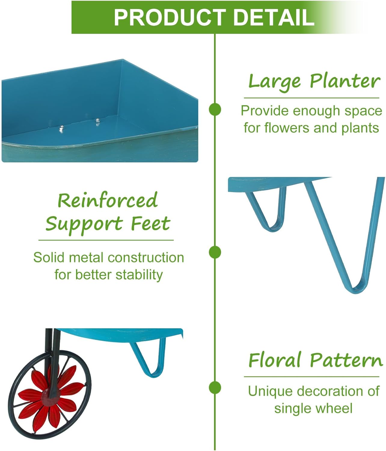 - Widely Use: With large groove design, the planters are perfect for planting small potted plants, succulents or flowers. You can arrange these wheelbarrows together, or place them in separate places to add color and interest to your garden or entryway