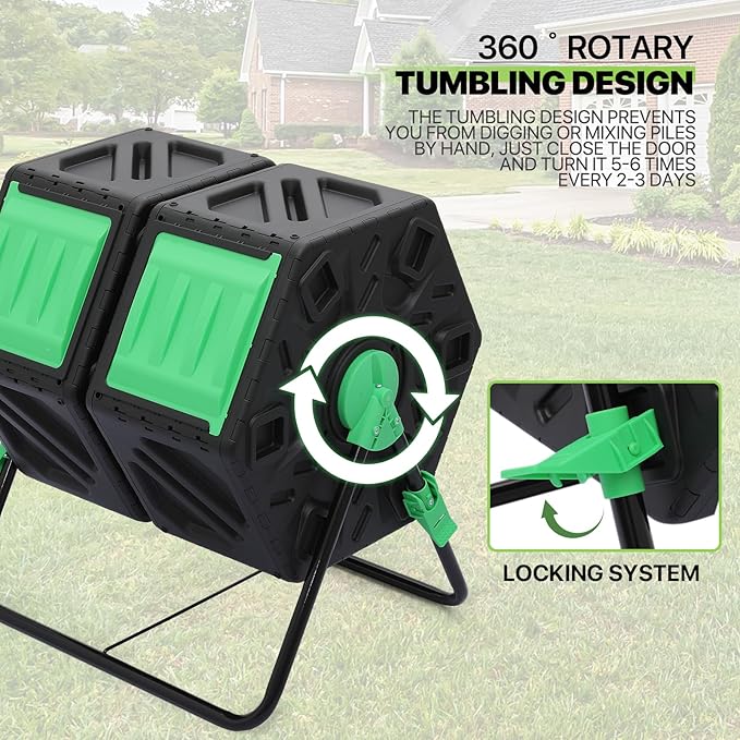 - Great Circulation System: Achieve your gardening goals with a steady supply of ready-to-use compost! This compost tumbler has two chambers, allowing you to add compost ingredients to one side while the other side cures. With internal mixing bars that speed up the decomposition process, you can expect rich, fertile compost in just 4-6 weeks.