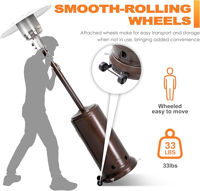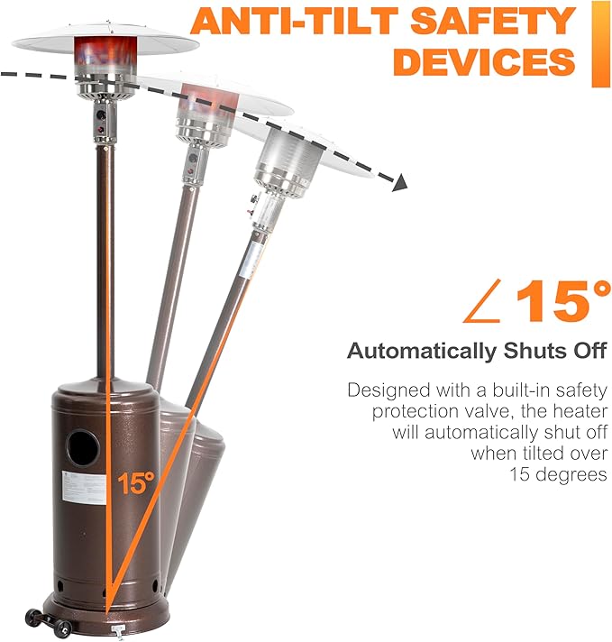 - INTERLLIGENT FLAMEOUT SYSTEM: Designed with a built-in safety protection valve, this outdoor propane patio heater will automatically shut off the fuel supply in time when outdoor propane gas heater tips over at a 15-degree angle