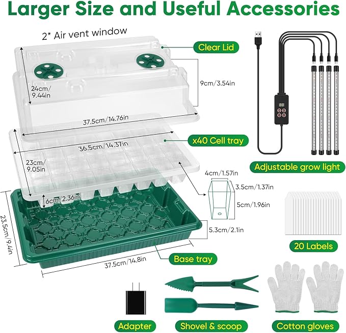- 【Adjustable Humidity/Light& Display Screen Timer】Upgraded seed starter tray design, our new version seed starter trays that you can add grow light strip to cultivate seed and adjustable vent hole cover to change the humidity of trays(note: when you install the round vent cover, please press harder) .Display screen of lighting time for better control growing situation of seeding,1-24 hours timed to choose,flexible working time will suitable for all kinds of seed to use.