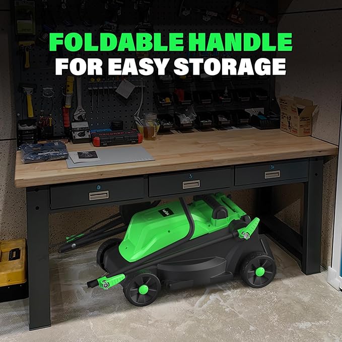 - ADJUSTABLE HEIGHTS: โ The electric lawn mower has three adjustable heights (1"-2.4") on the inside of the front wheels to meet different heights of mowing needs. โก Handlebar can be folded when placed to easily store in the corner or under the table without taking up too much space.