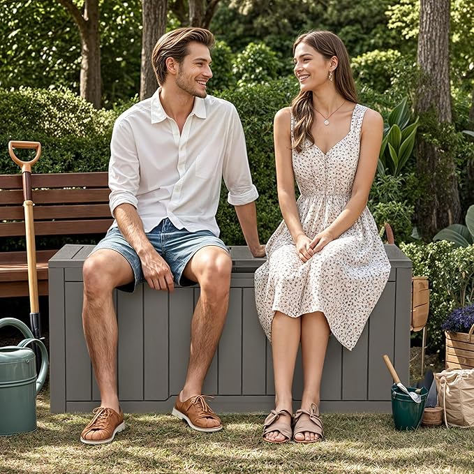 - Extra Seating: Doubling as a comfortable bench seat, this plastic deck box can support up to 485 pounds; Set it up in just 15-30 minutes, and enjoy its unique wood-grain texture that seamlessly blends with any patio or deck decor in no time