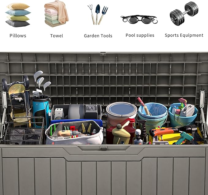 - Versatile and Secure: Our resin storage box is designed for both indoor or outdoor use, suitable for storing patio furniture cushions, gardening tools, pool accessories, and more; The deck box with lock design ensures your items stay safe and secure
