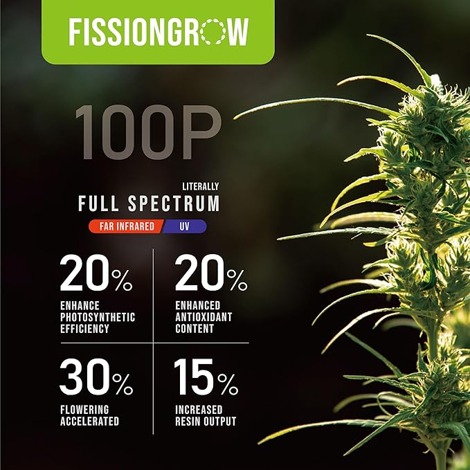 - 【 TRUE FULL SPECTRUM 】With UV,IR and Far Infrared, Compared to other similar grow lights, The FissionGROW 100P integrates the true full spectrum of light required by plants and enhances resin secretion and disease resistance with 385nm UV LEDs. This results in improve plant health and crop quality. It functions as a plant light for VEG and BLOOM as well.
