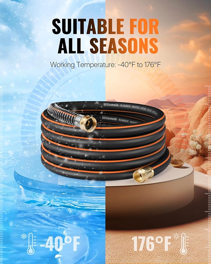 - High Elasticity and Durability: Made from pure rubber, the garden water hose is wear-resistant, elastic, and kink-resistant. It operates normally in temperatures ranging from -40°F to 176°F. Plus, the UV-resistant coating prevents discoloration or hardening even with prolonged outdoor use