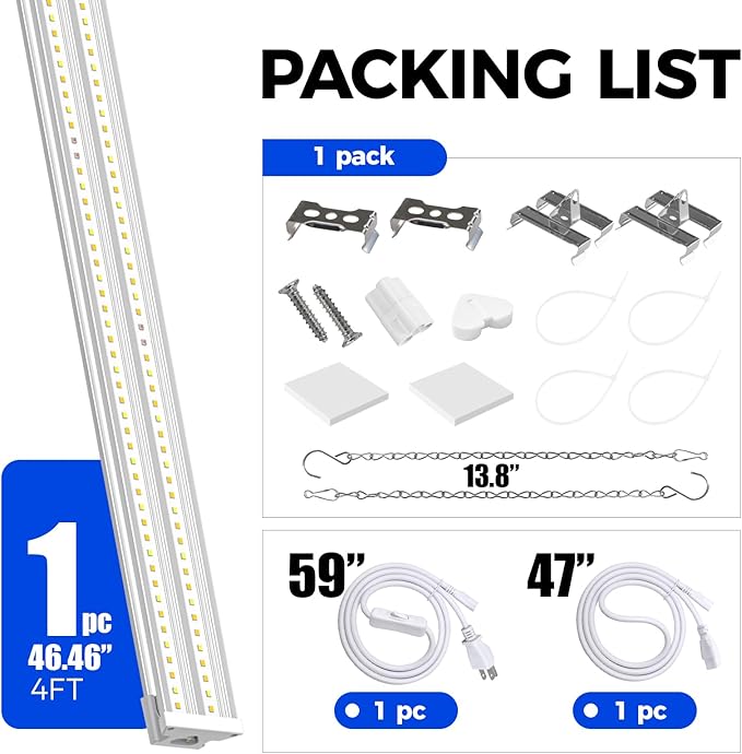 - Flexible & Easy Installation Options: Our full spectrum LED grow lights offer multiple installation methods for hanging or surface mounting. The package includes chains, hooks, anchors, cable ties, clips, and double-sided adhesive tape for quick and easy setup. Customize your lighting to effortlessly grow your indoor seedlings