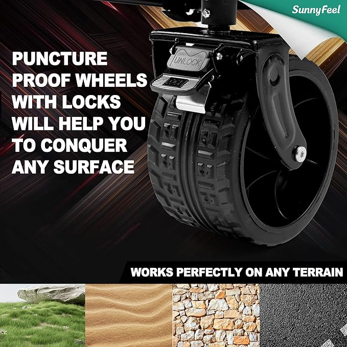 - 【360° Rotating Front Wheels& Locking Brake Design】The high-quality PVC wheels are abrasion-resistant, shock-absorbing, wear-proof, anti-slip, and silent, leaving no drag marks and enhancing the overall durability. The wagon features 360° rotating front wheels with brakes and 4-inch wide all-terrain PVC wheels, providing excellent impact resistance, smooth movement, and superior traction