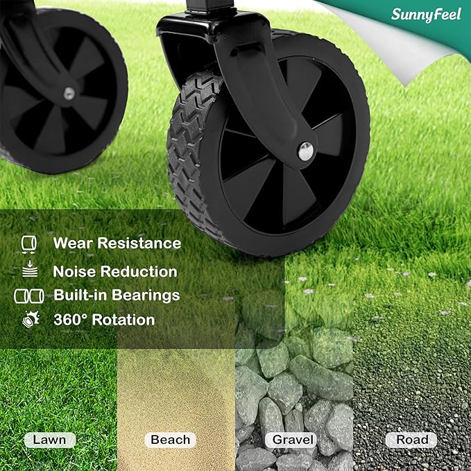 - 【360° Rotating Front Wheels】The high-quality PVC wheels are abrasion-resistant, shock-absorbing, wear-proof, anti-slip, and silent, leaving no drag marks and enhancing the overall durability. This collapsible wagon features 360° rotating front wheels with brakes and 4-inch wide all-terrain PVC wheels, providing excellent impact resistance, smooth movement, and superior traction