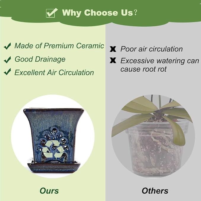 - 【 Optimal Air Flow & Efficient Drainage 】 The side body of these square ceramic orchid pots features strategically placed multiple holes to promotes air circulation. Additionally, a drainage hole at the bottom ensures effective water drainage, contributing to the overall health of your orchid's roots. The attached saucer collects excess water, maintaining a clean planting area