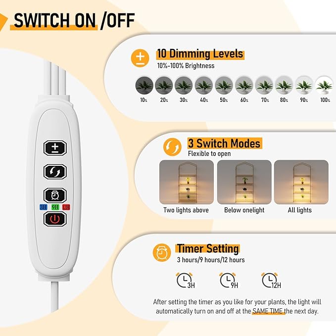 - Multi-function Switch: The switch provides 3 switching modes: Flexibility to turn on two lights above/one light below/all lights. It also provides three timing modes: 3/ 9/12 hours, facilitating automated lighting schedules. Additionally, the switch offers 10 levels of dimming, enabling the brightness to be adjusted from 10% to 100%. This versatile switch ensures the provision of optimal growing light for plants throughout the year