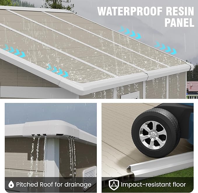 - [DOUBLE-WALL & STABLE STORAGE SHED]: Tough, double-wall resin construction and an impact-resistant floor are designed for long-term durability. The overlapping wall panels are water and moisture resistant for worry-free use in all weather conditions,Weather-resistant, waterproof and UV protected - will not peel, rot or rust.