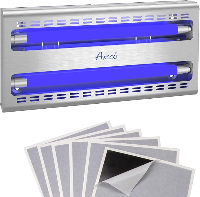 Awoco 12W LED Stainless Steel 100V-240V Wall Mount Sticky Fly Trap Lamp for Capturing Flies, Mosquitoes, Moths and Flying Insects, Perfect for Home, Restaurants, Warehouses (with 6 Glue Boards)