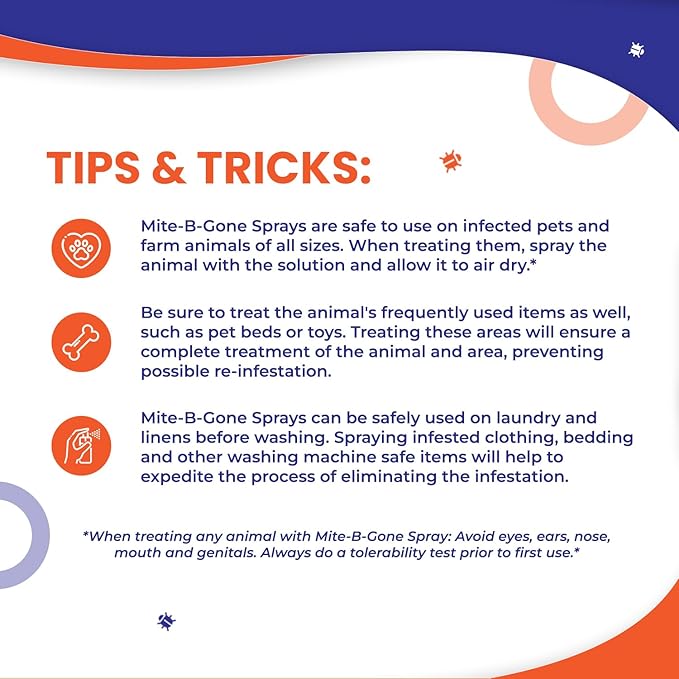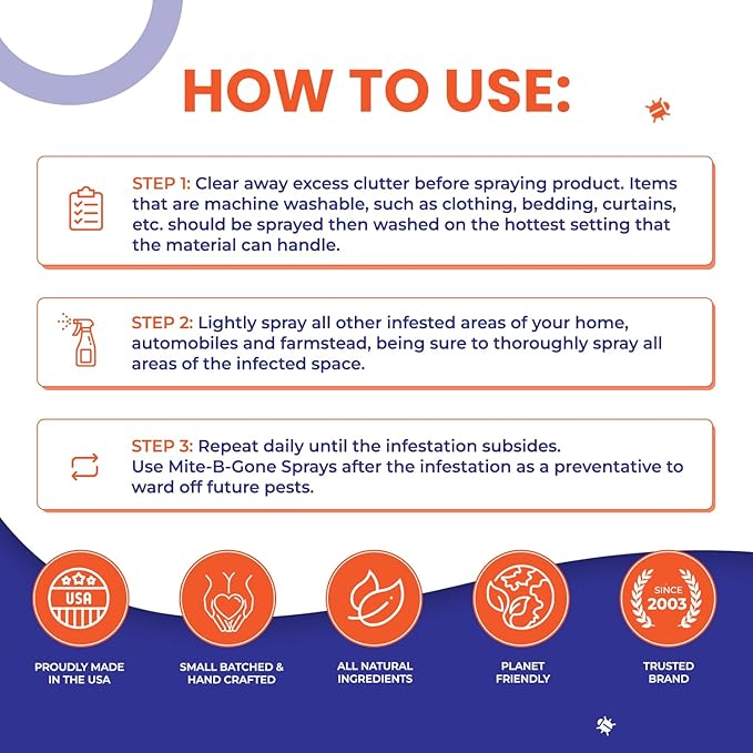 - RAPID PERFORMANCE: Mite-B-Gone Mite Killer Spray works quickly to tackle all types of mites, from human mites, spider mites, bird mites, rat mites, dust mites, carpet mites, and furniture mites. It is the ultimate solution for a mite-free home.