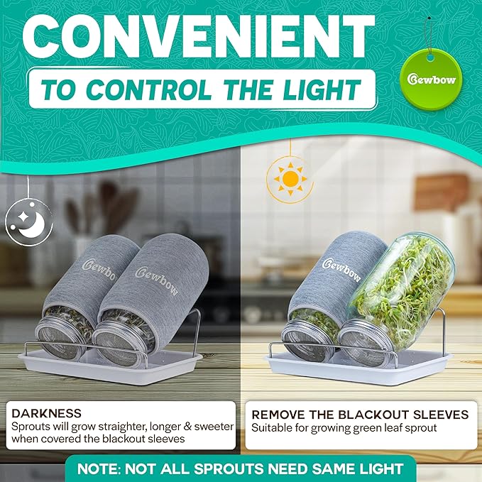 - [ Convenient & Easy to Use ] No soil or chemicals are required. Simply place your seeds in the jar, soak them in water at 40-50Β°C for 4-8 hours, then drain and position the jars on the stand. The blackout sleeves help regulate light exposure, encouraging the growth of straighter, sweeter, and longer sprouts. For best results, watering the seeds 2-3 times a day. Once sprouting begins, remove the sleeves to promote green leaf development.