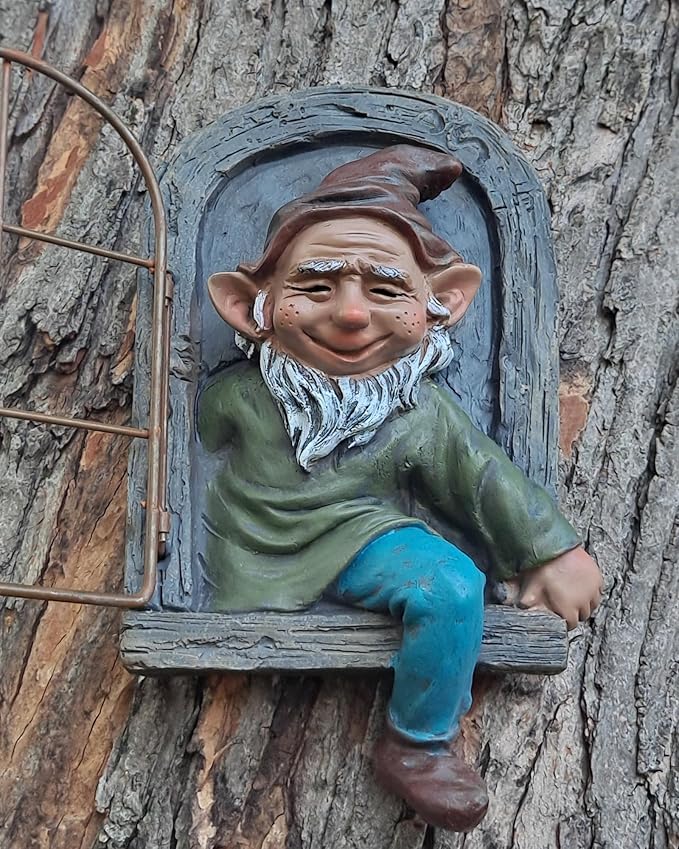 - GARDEN FAIRY STATUE: Greet your visitors with a friendly welcome from this charming garden gnome. Add a fun touch to your garden with this cute little elf that gives the illusion of climbing out of a wooden window. Place him near your tree or fence for a delightful display.