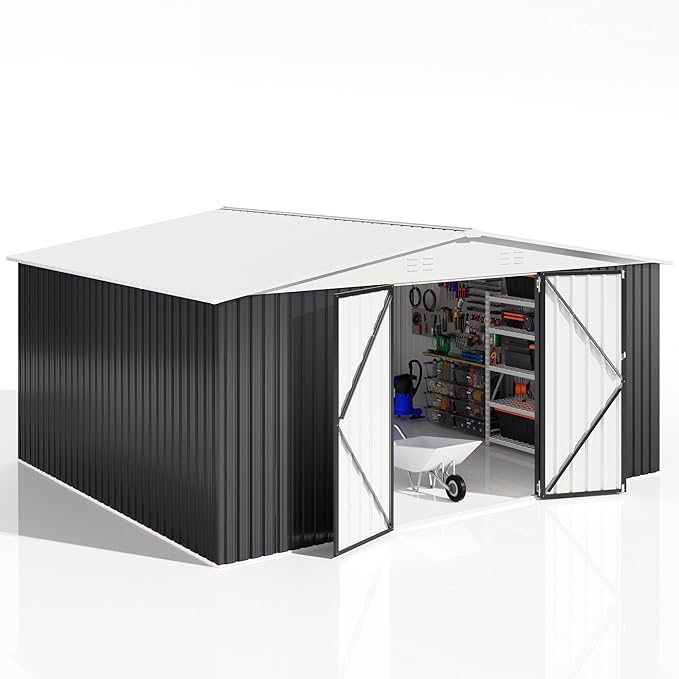 12x14 FT Outdoor Storage Shed, Garden Shed with Updated Frame Structure and Lockable Doors, Metal Tool Sheds for Backyard Garden Patio Lawn, White