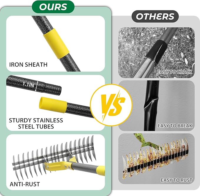 - Works Two Ways-The dethatcher rake has strong metal teeth on both sides. One side picks up yard waste while the other side smooths dirt. It helps break up hard ground so water, sun, and plant food can reach grass roots better.