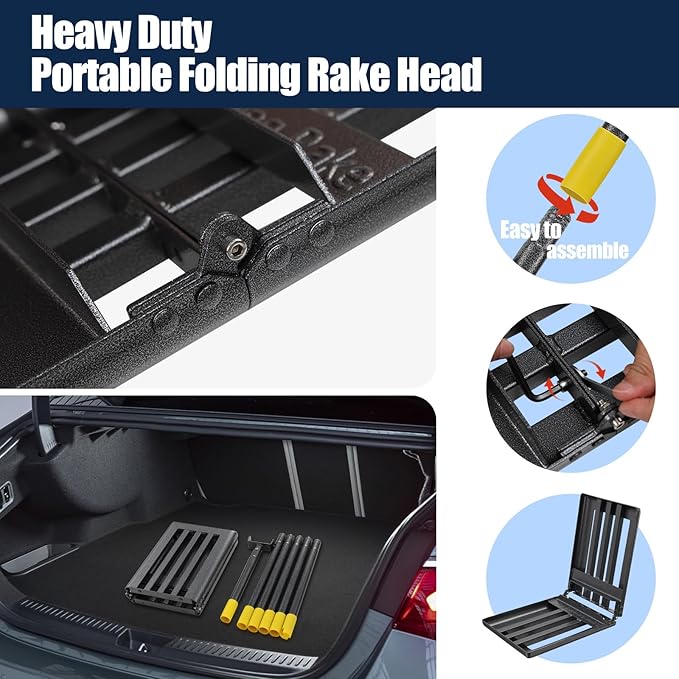 - 2️⃣ SPACE SAVING INNOVATION:Patented folding design folds the rake head to 10" wide for easy storage in the garage/carport - Includes hanging holes for wall