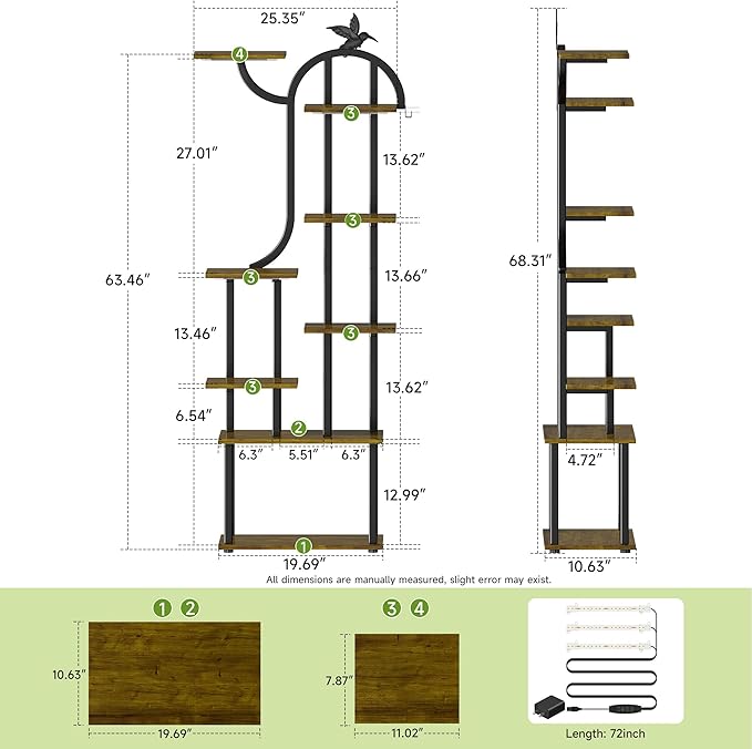 - 【Multiple Uses】This corner plant stand with grow lights is not only a great plant holder that serves as an excellent houseplant organizer and space-saving solution, but it can also function as a display rack. You can place decorative items, photos, and other small items on the top shelf, and store books on the bottom shelf. This tiered plant stand also makes a fantastic home decor piece.
