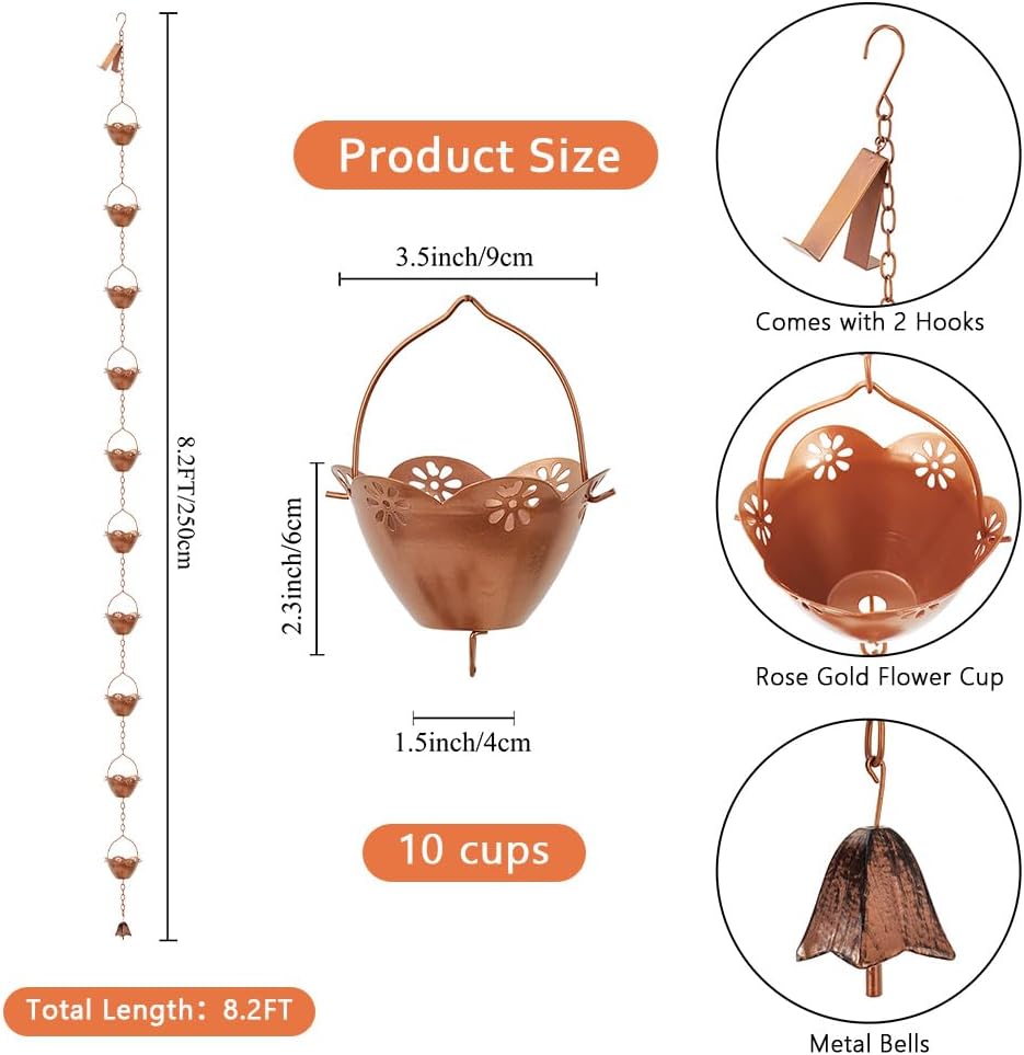 - Lotus Rain Chain: The 8.2-foot rain chain consists of 10 lotus cups, hanging on the gutter, which can not only effectively guide the flow of rainwater, but also decorate the eaves. Whether sunny or rainy, it can add elegance to the appearance of your house