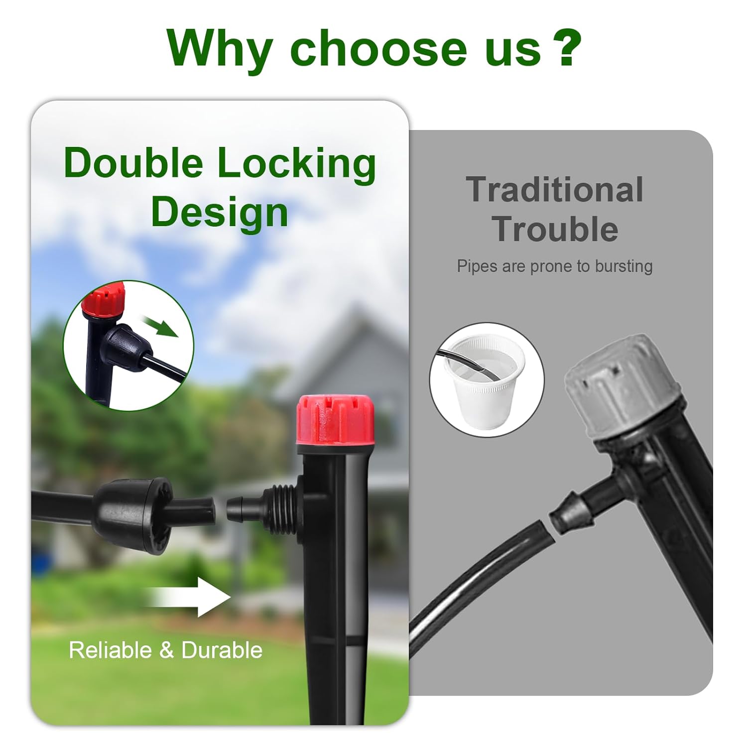- Unique Design: Our Drip Emitters are Double Locking Design, which ensures a solid installation, prevents the hose from falling off and prevents water leakage. Drip Irrigation Sprinkler heads are removable and easy to clean, so you don't have to worry about clogging, making them perfect for long-term use.