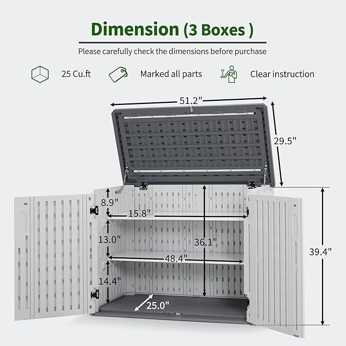 - Plastic Shed: Overall Dimension: 52.16 (W) x 28.34 (D) x 38.58 (H) inch; Internal Dimension: 48.43 (W) x 25.00 (D) x 36.10 (H) inch