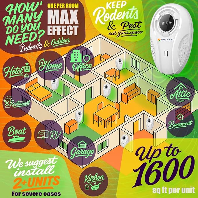 RX-78, Ultrasonic Pest Control Repeller - Electronic & Ultrasound, Indoor Plug-in Repellent - Get rid of - Rodents, Mice, Squirrels, Bats, Insects, Bed Bugs, Ants, Fleas, Spiders, Roaches (6Pack)