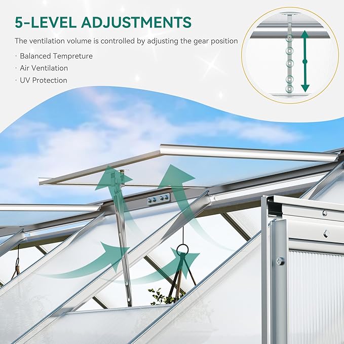 - UPGRADED MATERIALS- 6x8FT polycarbonate greenhouse is constructed using a reinforced aluminum alloy frame, along with reinforced rods on the sides and diagonal rod fixation for enhanced sturdiness and load-bearing capacity; Double-wall polycarbonate boards with 4mm UV protection effectively blocks 99% of UV radiation to protect your plants