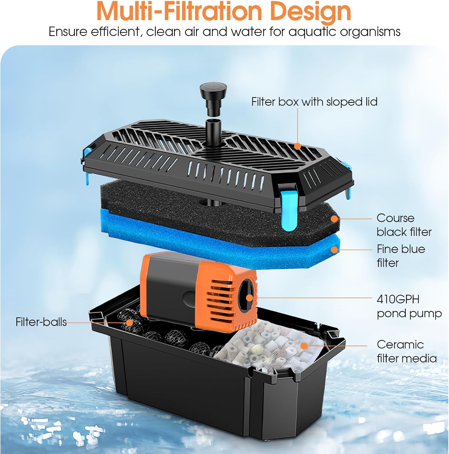- 🐟【Integrated Filtration System】Solar Water Pump with Pond Filter is a comprehensive solution for maintaining crystal-clear water in small ponds. The kit includes: 1* 30W Solar Panel/1* Filter Box/1* Water Pump/4* Adjustable Nozzles & Diverter Valve/2* Filter Pads/10* Bio-Balls/500G*Ceramic Filtrations/1* User Manual. Specially designed to promote a healthy water balance, this system effectively filters debris, protecting your pump durability under long-time continuous work.