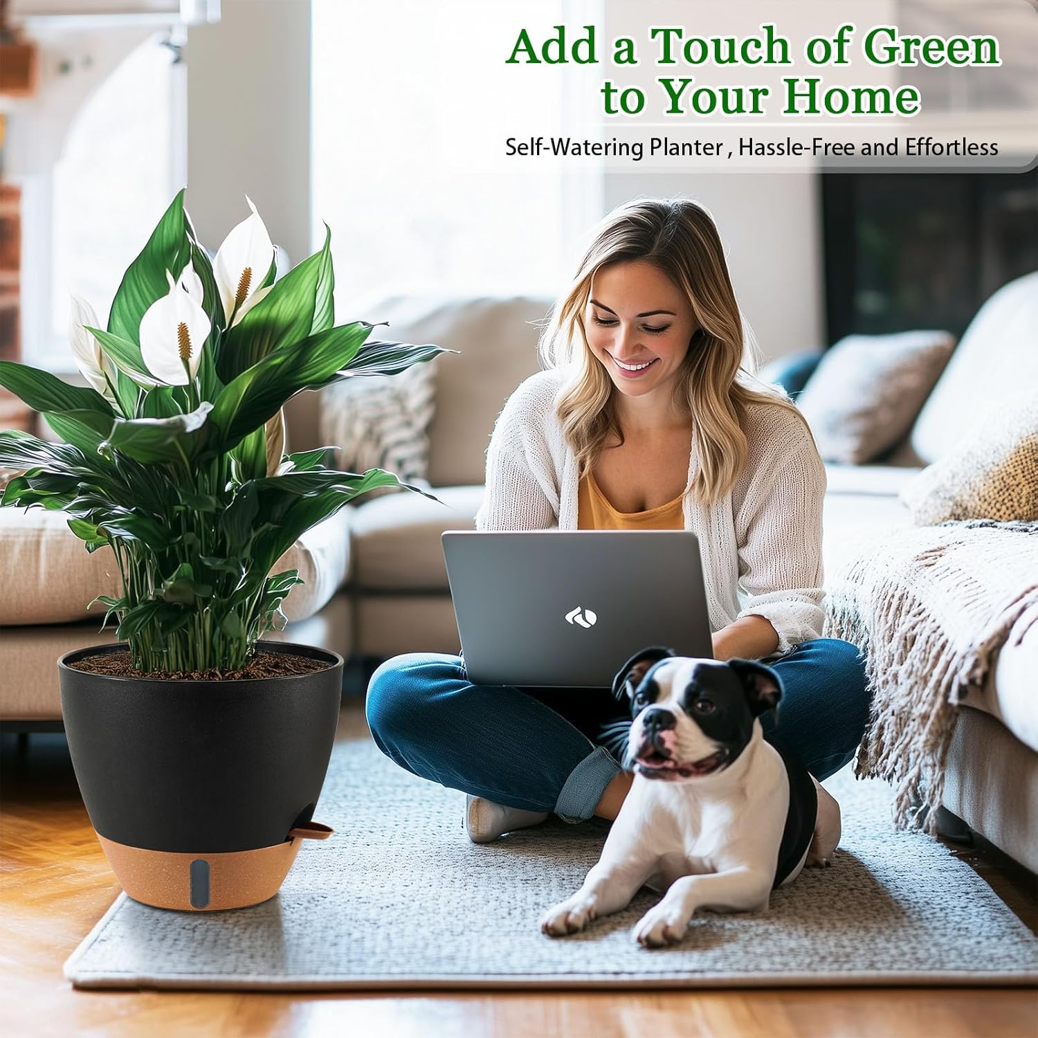 8/10/12 Inch Self Watering Pots for Indoor/Outdoor Plants - Large Plastic Planter with Drainage Holes, Water Level Indicator & Deep Reservoir, Modern Decorative Flower Pots (Black)