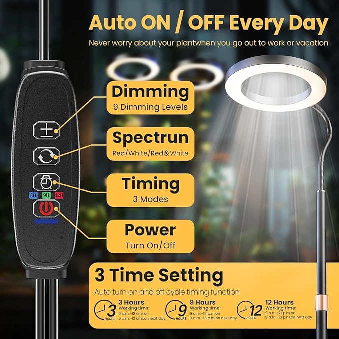 - Three cycle timing settings, this plant light will automatically turn on/off according to your desired schedule every day: 3/9/12H.