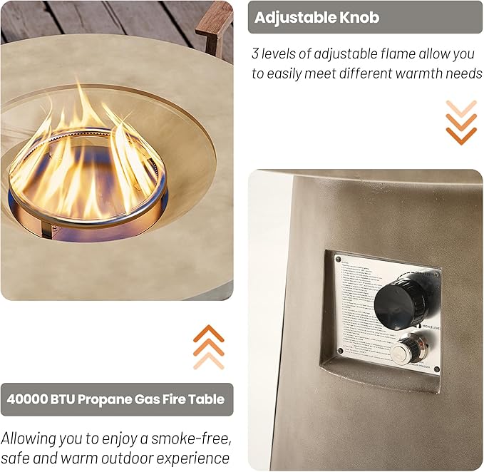 - 【Eco-friendly and Smoke-free Design】: Our outdoor fire pit is environmentally friendly, use propane gas to support stable and clean burning. The heat output is 40,000 BTU providing ample warmth and creating a romantic bonfire atmosphere in the chilling winter or summer nights. This portable propane fire pit table will perfectly compliments pool, deck, porch, balcony or any outside space.