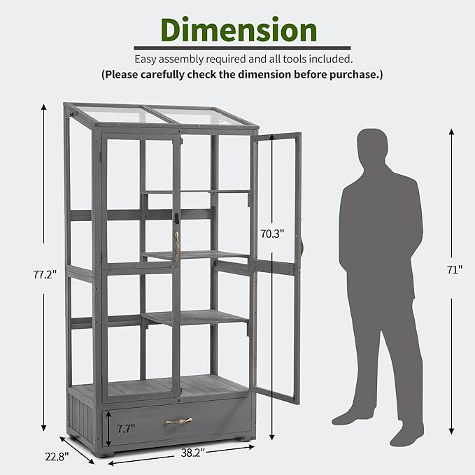 - Multiple Storage Space: There are 3 shelves and 1 large space in the garden greenhouse for daily storage of various types of plants and tools (Overall Dimension: 38.2"L x 22.8"W x 77.2"H)