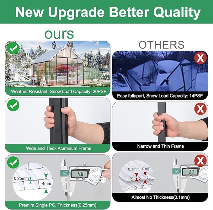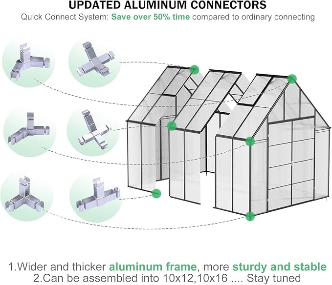 - Sturdy Frame: Our greenhouse kit boasts a robust rust-resistant aluminum frame designed to withstand various weather conditions. 2 skilled enthusiasts can assemble this greenhouse kit within just 4-6 hours. Introducing patented technology, Easy assembly, saving you 50% of your time. Gone are the days of tedious setups. With a simple push and locking screw, our Quick Connect ensures a reliable, secure, and swift link-up. It can also support snow loads of up to 20PSF