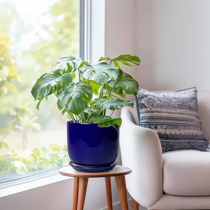 8 Inch Ceramic Plant Pot - Decorative Round Planter for Indoor Plants with Drainage Hole and Saucer, Home House Room Office Garden Decor, Blue