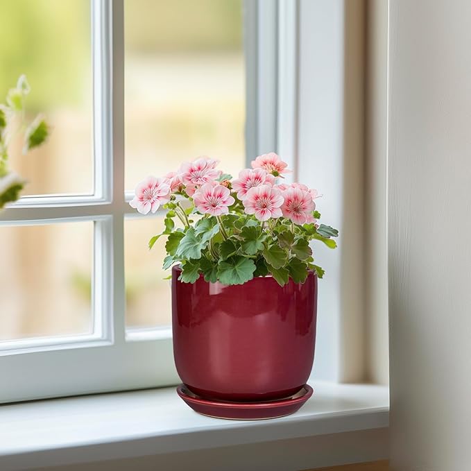 Ceramic Plant Pot - 5 Inch Modern Round Planter for Indoor Plants with Drainage Hole and Saucer, Patio Office House Room Bathroom Decor, Red