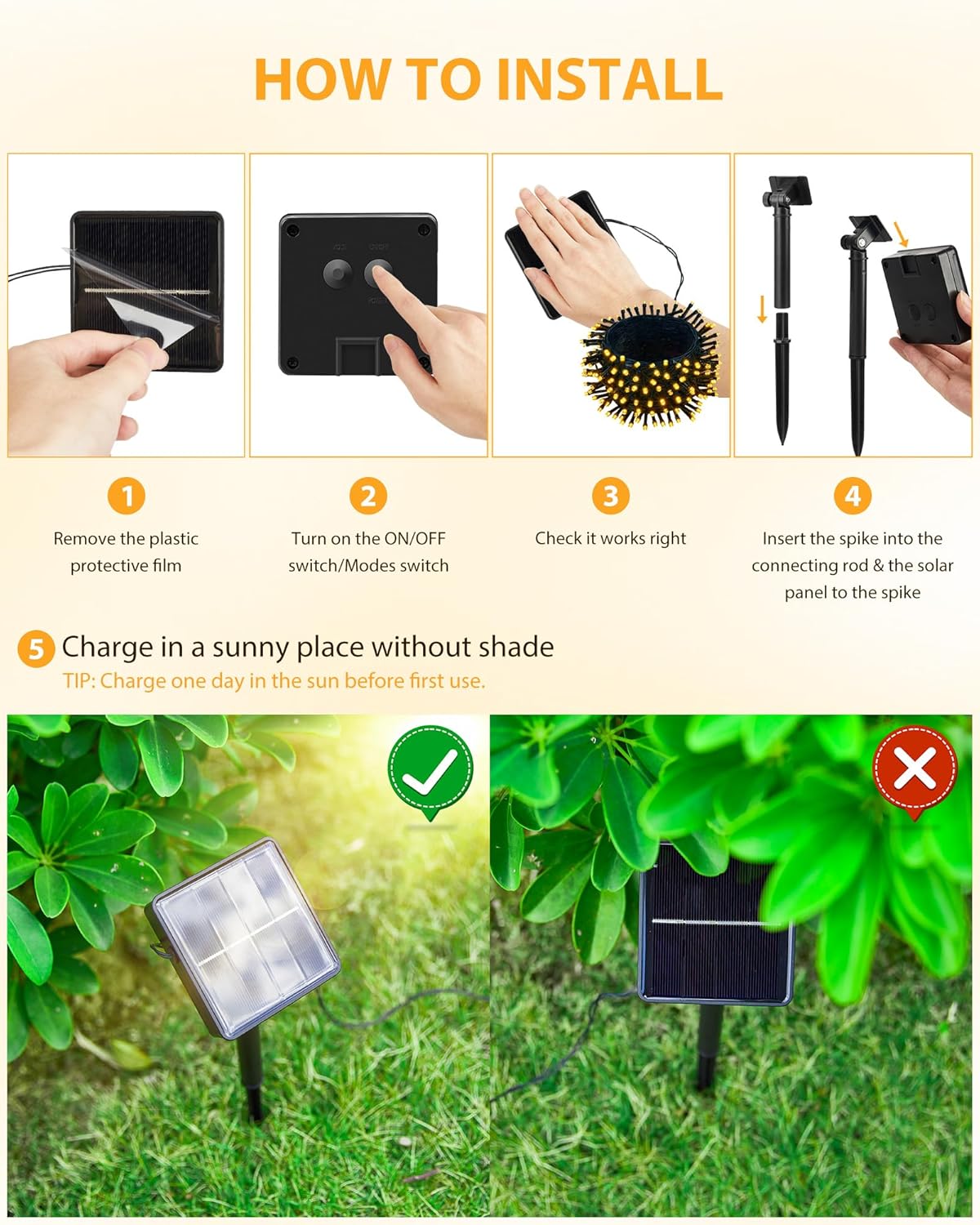 - 【Auto On/Off & Easy Installation】Solar outdoor lights fully charged under direct sunlight for 4-6 hours, they can work up to 8-10 hours at night, the outdoor solar lights automatically turn on at dusk and auto off at dawn. Also, solar christmas string lights with ground stake is easy to install, just stake into the ground, and our string lights have soft light cords, very suitable for DIY any shape.