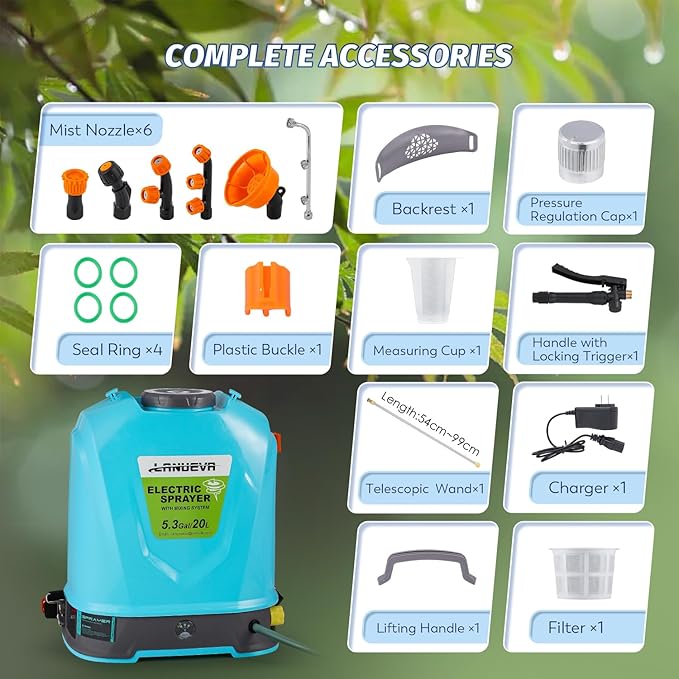 - Effortless Assembly The kit includes everything you need for quick setup: 6 mist nozzles (single, double, three-nozzle, metal three-nozzle, four-hole pattern, and six-hole pattern), a backrest, a telescopic wand, a shoulder strap, a charger, 4 seal rings, and the 5.3-gallon (20L) water tank, etc. The installation process is simple and can be done in just 5 minutes by following the clear instructions provided.