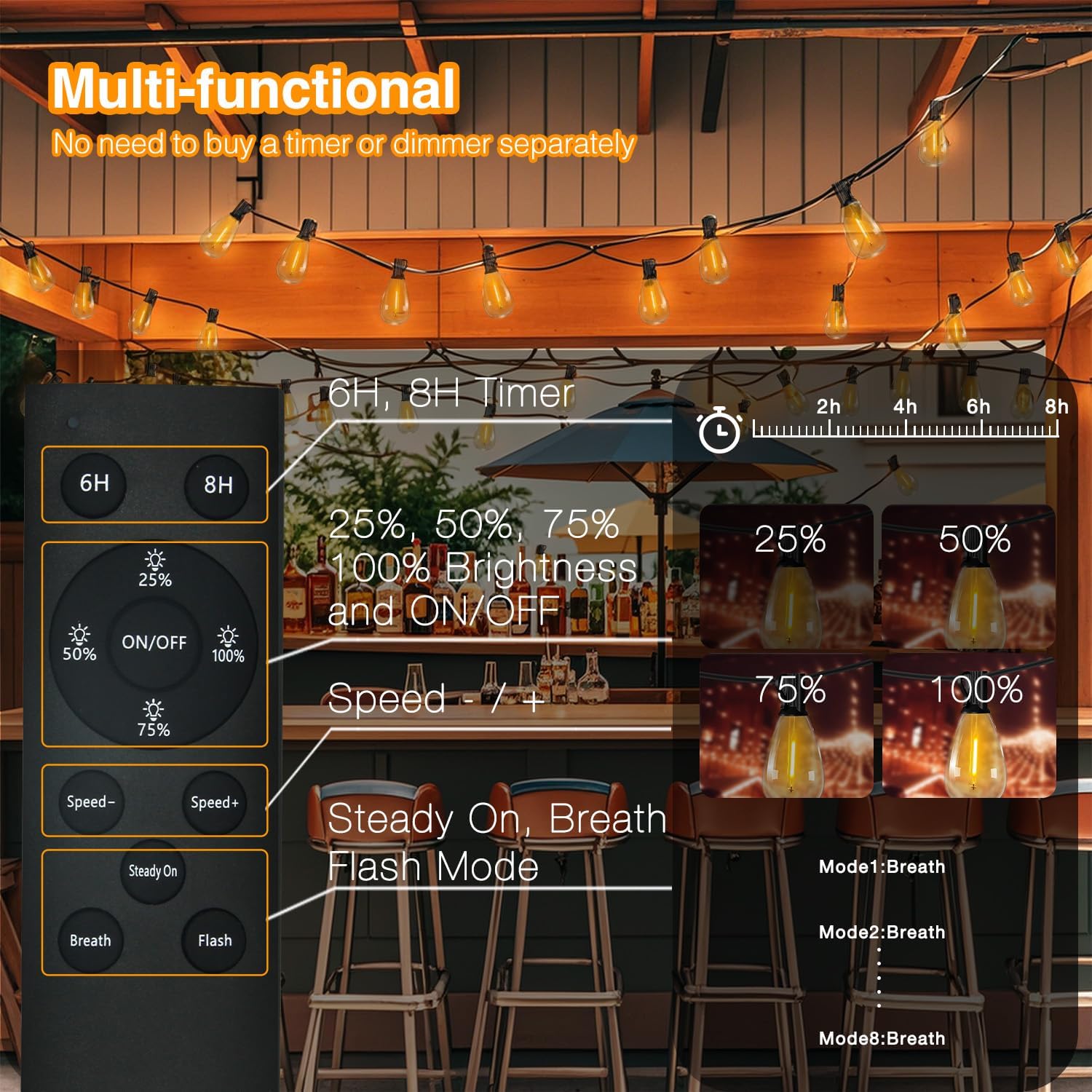 - Solar String Lights Outdoor 100FT with 5W solar panel Shatterproof and Waterproof. Solar String Lights come with several lighting modes, including steady on, flashing, or fading. Luces solares automáticas